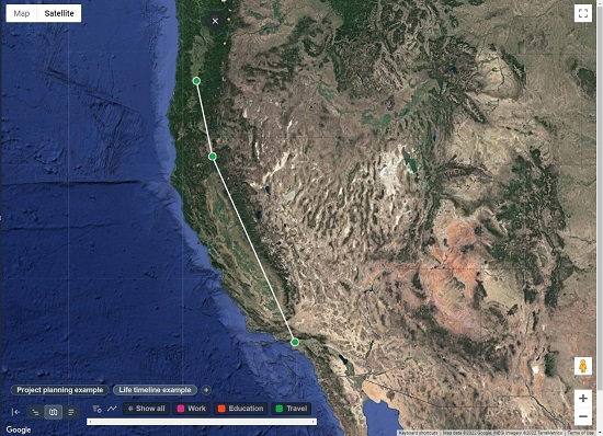The above event from 18th Feb. 2022 to 21st Feb 2022 is tagged as ‘Travel’ and the locations of the journey are provided in the event description. Maps of each location will be displayed when you click on the Event. Also, if you view this event in the Map View, you will be shown a route with each location connected with dots.