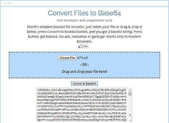 Browserling.com offers a free tool to convert files to Base64. With this tool, you can convert your PDF file to Base64 format. To do so, just upload your PDF file to the website and click the ‘Convert to Base64!‘ button. It will convert your PDF and will give you the Base64 string for that. You can simply copy the Base64 string from there and use it wherever you intended to.