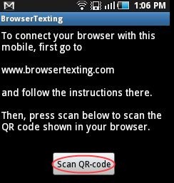 Step 5: Then you have to run the app installed that is “BrowserTexting SMS from PC” and click on “Scan QR-Code” on your Android device. For Scanning QR-Code you need to have Barcode Scanner App installed in your Android device. It will automatically scan the QR-Code displayed and will read the URL for automatic connecting with computer.