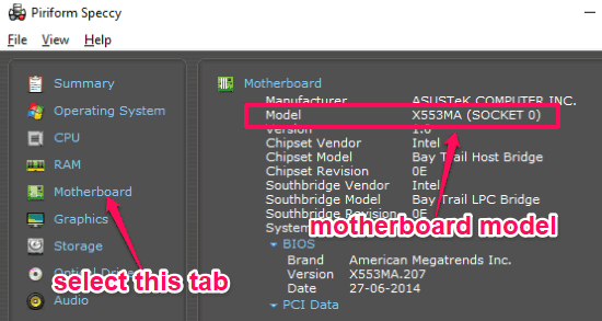 Step 2: To see the information about the motherboard of your PC, simply click on the “Motherboard” tab on the left. As soon as you do that, you can see the motherboard model of your Windows PC, as shown below. Additionally, you will also see chipset vendor, chipset model, Southbridge model, BIOS brand, and more.