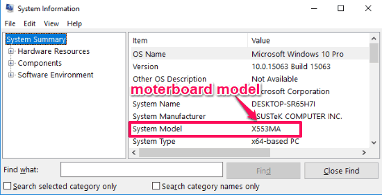 Step 2: As soon as you do that, it will open up the “System Information” window and under the “System Summary” tab you will see the motherboard model. The model number will be written on the right of “System Model”, as shown below.