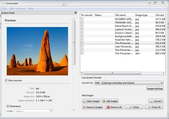 Coverseen is another free image converter software using which you can convert images to any major image formats. Apart from converting images, you can use this free image converter to even resize images. This free image converter supports formats like PNG, TIFF, JPEG, GIF, DPX, EXR, SVG, etc. In addition, this tool is capable enough to perform bulk image conversion or resize. The user-interface is clean and easy to understand, so even the novice users won’t face an issue in using Coverseen. You are even allowed to compress the images, adjust the resolution for images. This free image converter even shows you details for images like image format, image size, image resolution and image size. Download Coverseen for free.