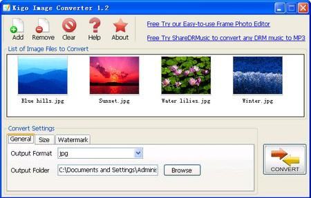 Kigo Image Converter is a free image converter software to convert images to any of the format that it supports. This image converter supports all major formats like JPG, J2K, BMP, TIFF, TGA, PNG, PCX, PNM, etc. Apart from just converting the images to multiple formats, it even lets you add watermarks to images and also allows you to adjust the size of images. This is an easy to use image converter, as you simply need to select the images that you wish to convert, choose the output format. The selected images will we shown as thumbnails. Now, you need to click the convert button on the interface for converting images. In this way, you can effortlessly convert images.