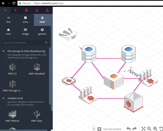 Arcentry is another AWS diagram generator that you can try. In the free version, it lets you create 3 cloud architecture diagrams and you can add up to 30 components in each diagram. You can easily create your diagram by adding different AWS components and save the design. You can add the AWS components like EC2, AWS snowball, AWS Athena, AWS Glue, GCC cloud storage, blocks, API gateways, load balancers, VPN, and many others.