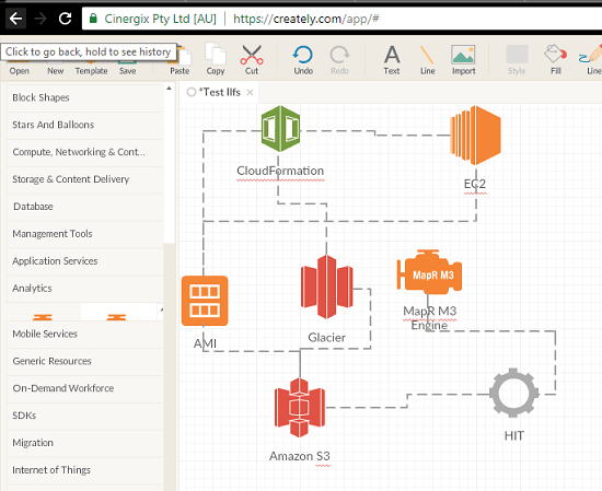 Creately is the last free website in my list that you can use to generate AWS diagram online for free. This is a simple tool and puts so many restrictions in the free version than any other website in this list. Here in the free plan, you can create 1 project only and it can have 5 public diagrams in it. In addition to this, you can add 3 collaborators too. The interface of the website is nice to create AWS architecture diagram and you will find almost all the services there. After signing up, start creating your diagram. It supports AWS services like databases, networking, management tools, analytics, AWS SDKs, and many others. In the free version, you can only export your diagram as an image.