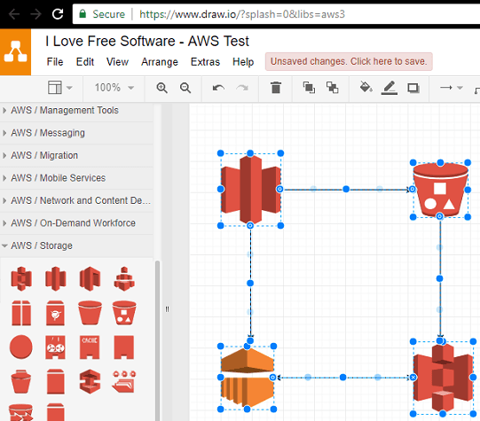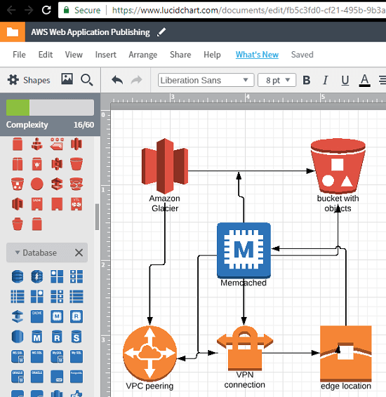 Lucidcahart is yet another popular website to make charts online and supports other technical diagrams. And luckily, it supports AWS cloud diagrams too. Just like all the websites that I have listed in this post, you can use it in the same way. It has all the icons for popular AWS services and you can easily use them in your diagrams. By just simple drag and drop operations, you can add S3 buckets, S3 buckets with objects, Glacier vaults, VPNs, caches, snapshots, gateways, database instances, database migrations services, and many others. You can add all these in your diagram and then save it. Also, you can connect different services with the help of arrows and then download the final diagram. It lets you export the diagram as SVG, PDF, PNG, JPG, and in some other formats.