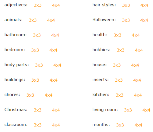 Tools for Educators can also be used as a bingo card generator for teachers. The site offers different categories such as adjectives, animals, question words, Christmas, classroom, verbs, phrasal verbs and many more.