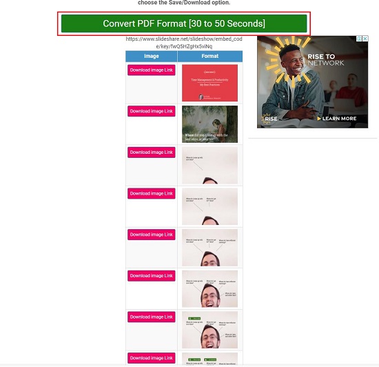 Paste the URL of the chosen slideshow from SlideShare and click on the ‘Download’ button and wait for a few seconds. You will notice that each and every slide in the presentation will be converted to an image that you can download by clicking on the corresponding link beside the image.