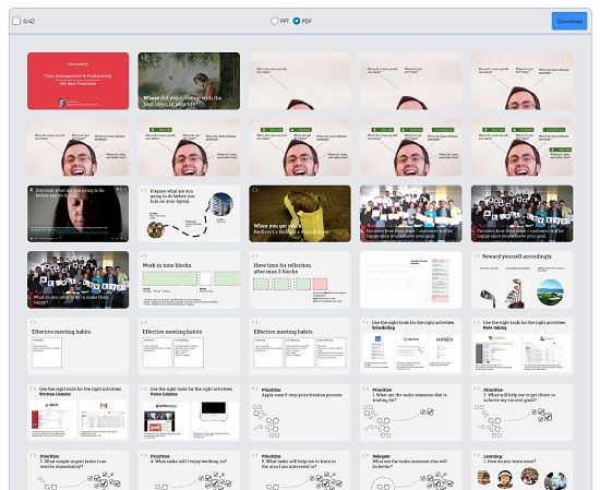 Next, click on the respective radio button (PDF / PPT) to choose the output format. Now, click on the slides that you wish to download or click on the checkbox at the top left to select all the slides. Finally, hit the download button at the top right to download the chosen slides or the entire presentation to your computer.
