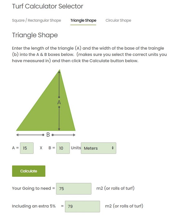 Next, click on the ‘Calculate’ button and the Total Turf Area will be displayed as well as the Rolls of Turf that you require (considering that the area of each Roll is 1 sq. m)