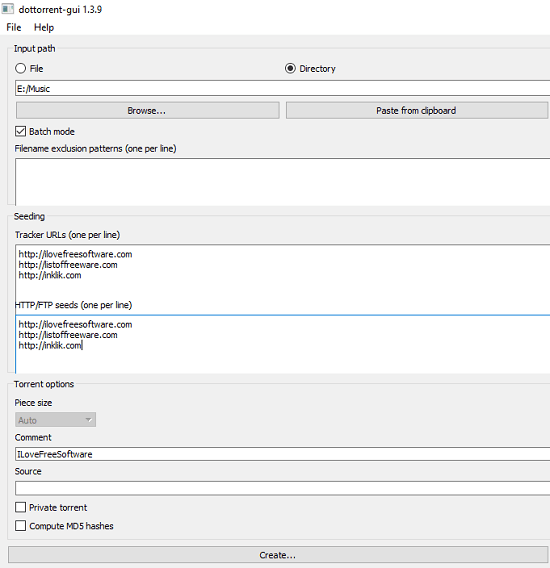 Dottorrent-gui is yet another free software to create torrent files easily in Windows. Just like the software above, it can generate the torrent files in batch. But don’t worry, if you want to use it to create a single torrent file, then you can do that. It takes a local file from your PC to generate the corresponding torrent file. Or, it can also take a directory full of local files to generate the corresponding torrent file for each one of them. You can easily define the trackers, seeds, and other metadata about the torrents and get the final torrent file.