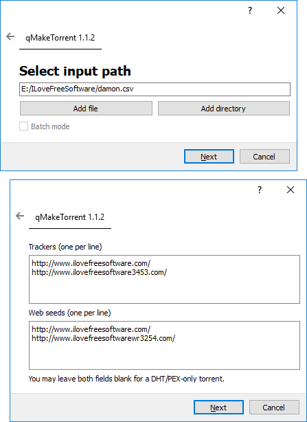qMakeTorrent comes with a wizard like interface that you can use to generate torrent files in bulk. Just run the software and then specify a single file or a complete folder for which you want to generate the corresponding torrent files. After selecting the source files, the software will ask you to enter the details of the trackers and the metadata information. Finally, in the end, it will ask you to specify a location where it will save the final torrent files.