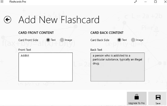 Flashcards Pro is a free flashcard maker app for Windows 10. When you download and start this app, you will see the home interface with a menu to create a new set, manage your existing sets, settings option, export option, etc. So we will start with create a new set option and a screen like the one shown above will come in front of you. Here you will add content to your flashcard. You can choose to add text or image to your flashcards. You will have to add text or images to the front and back side of the flashcard. So front will have the question and back side of the flashcard will have the answer. Once you have added your data click the save button at the bottom right corner. This will save the flashcard and bring up another one to be added.