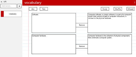 My FlashCards Beta is a free flashcard maker app. The app has a simple interface, when you start the app just give a name to your new set and click the plus icon to create a new set. After creating a new set, add a new section and start adding flashcard to it. You will be seeing a screen like the one shown in the screenshot above. Just click the plus icon you see on the left side and then select from the two given button abc or pen. Two boxes will open up where you can add your content. One is for the front side of the flashcard and one is for the backside of the flashcard. Click the plus icon given in between both the boxes to add your flashcard, keep doing so for all the cards you want to add. When you are done click the close button given on the right side. Once you are done click the study button to go the flashcard study mode as shown in the screenshot below.