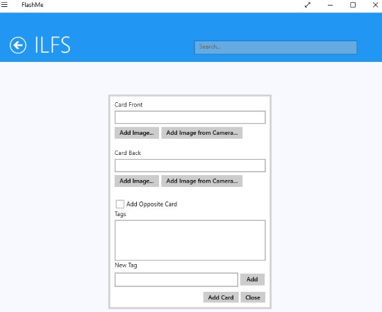 FlashMe is a free app to make flashcards. When you start the app the home page of the app just has a help tile on it. Right click anywhere on the app window and a toolbar will come up with the add deck option, click on this option. You will be asked to name your new set, after that a window like the one shown in the screenshot above will open up. Here you can add the text or image for the front side of the card. Then enter the text or image for the backside of the card. You also get the option to add tags for the cards. Click the add card button to add your card and move on to adding another one. If you are done adding, then click the close button.