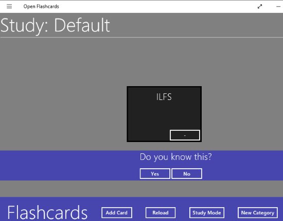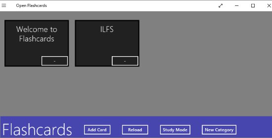 Open Flashcards is a free flashcard making app for Windows 10. When you start the app you will see a plain interface with a black colored flashcard tiles. When you click on the black flashcard it will turn over and show the other side of the card. Now you can add your flashcards to this page itself. Just click the add card button at the bottom of the app screen. You can even create a new category for your flashcards. Add new cards one by one. The you can go and study them in the study mode.