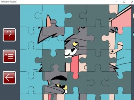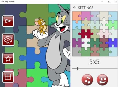 Tom Jerry Puzzles is a jigsaw puzzle game based on the Tom and Jerry theme. When you start the app you will see a interface like the one shown in the screenshot above. When you click on the settings gear icon on the left a window will open up which will let you select the number of pieces you want in your jigsaw puzzle, like shown in the above screenshot. Right now it shows a 5 x 5 grid, which you can easily change using the slider given. The play button at the top will start the game for you and will bring up a game window, like the one shown in the screenshot below.