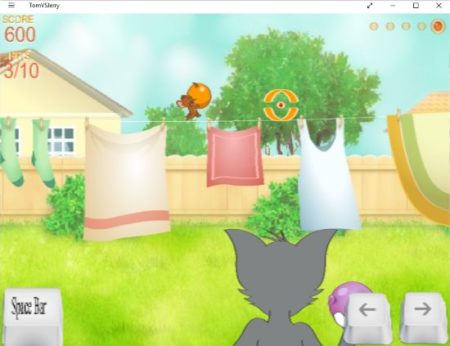 As you can see Jerry and Nibbles will be running across on the wire and Tom who is standing a little far has to throw water balloons at them to stop them. For aiming you can use the arrow keys on your computer and for throwing the balloon use the space bar. Make sure you aim properly before hitting, because you will get only 5 chances, after 5 misses its game over for you. You also have to keep in mind that the balloon takes some time to travel towards the mouse as well, so shoot a little ahead on the bulls eye that you have pointed using the arrow keys.