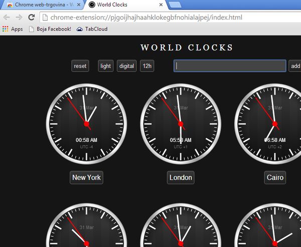 As you can see from its image above, when you run this app, it opens up in a new tab. By default you’re gonna see analog clocks and you’ll be able to track time for New York, London, Cairo, New Delhi, Beijing and Tokyo. By clicking on “Digital” from the top menu, analog clocks are replaced with digital ones. To add a new town to the list, type its name in the top right corner field and click Add. Other settings are also available for example you can change the background of the clocks to white, instead of the dark template that can be seen on the image above. Selection between 12h and 24h time format is also available.