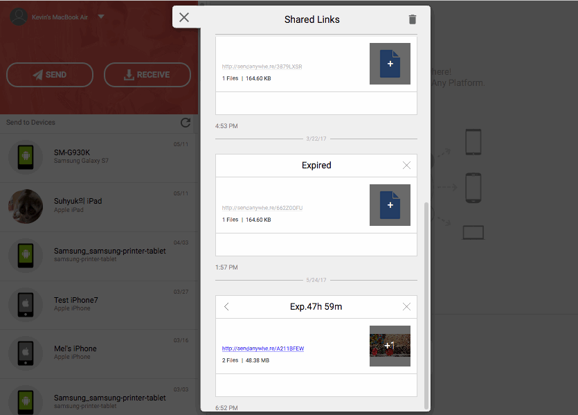 The link will be valid for the next 7 days, but you can delete it anytime you want. There you will also see a “Device” icon which will show all the devices to which you have recently sent files. You can select the devices to directly send the files.