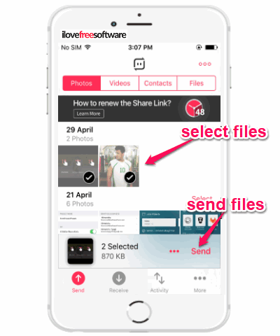 After you install and open Send Anywhere app on your iPhone, you will be able to see all your photos, videos, contacts, and other files on the “Send” tab. There you can choose the files which you want to share with others. The generated key (with 10 minutes validity) can be shared with the recipients for downloading the files. Similar to the Android app, you can also send files to nearby devices or use “Share Link” feature to share files via social media, messenger etc. like the Send Anywhere Android app.