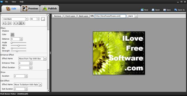 When creating a new project, you can choose from templates that follow the usual banner sizes, or create custom sized banner. Once you’ve done that, you’re taken to the “Edit” tab, pictured on the screenshot above. Here you need to change the default text, font style, formatting, tweak effects, effect duration, etc. Effects are for the most part applied to text. There’s a lot of them, typewriter (text is typed onto banner), fade in, swing, move, throw, swivel and more. “Preview” tab will show you a preview of the animation before publishing, which is the last step of the process. Export gives you SWF file with accompanying HTML document where embed codes can be found.