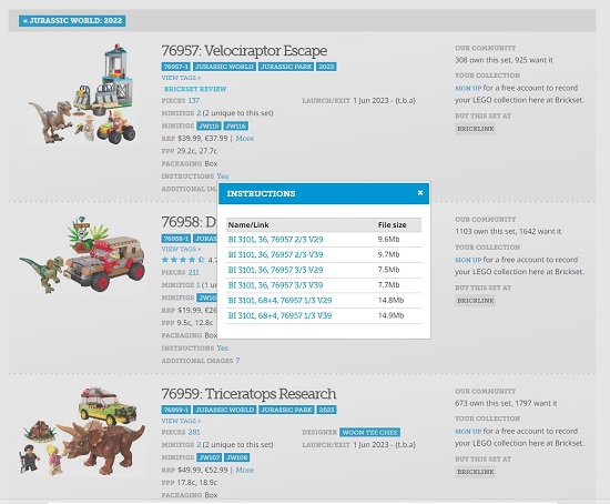 Sets and Minifigs are listed on the ‘Our Database’ page and neatly categorized by Theme & Release year, Release year and Month, Retirement year and Month and more. Click on any these links and then click on the corresponding set to view the details of the collection such as number of pieces, packaging, launch / exit date and more including. Click on the ‘Yes’ beside the Instructions field to open to get the download links and then click on any of the given links download the file in PDF format. You must remember that not all the LEGO sets or designs will have an instructions document.