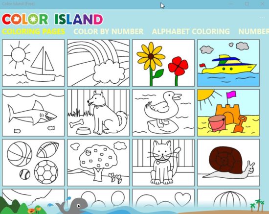 Color Island free is another fun free coloring pages app where you get lots of coloring pages. You can color pages by category like numbers, alphabets, and blank pages. You can open any coloring page and start coloring them. You can recolor any page, by clicking the reset button. When you open a coloring page you will get options on the left side of the page. The first option on the left side is for choosing your coloring tool. You can choose between brush, marker, spray can, paint bucket, and eraser. The last option which says size will let you change the size of brush, marker, and eraser. The second option is color which offers you a lot of colors to choose from. The clear screen button will clear what ever you have done so far and show you the blank image again. Color by number tab on the home page will have numbers marked in each area of the coloring image. Also at the bottom of the image you will see colors mentioned to corresponding numbers which need to be filled in the page.