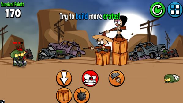 Crates are used as a temporary protection against waves of zombies, because as we all know, zombies can’t jump. Zombies will eventually destroy the crate and get to you, so you have to combine building new crates, shooting zombies and more in order to survive. Icing on the cake is the fact that multiple characters can be played with at the same time, zombies attack from both sides and of course there are points with which better guns can be bought, etc.