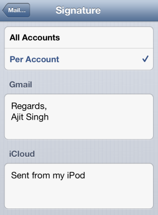 From here, go to Signature option and tap on it. You will find two options: All Accounts and Per Account. Tap on Per Account and you will see all the mail accounts linked by you with the app, along with a text box containing mail signature. Just tap on box and write the email signature you want to set. After this, tap on the icon at top left to save the mail signature. That’s it; now you have a separare signature for each of your mail account.