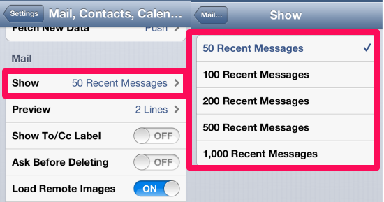 To adjust it, go to Settings and then Mail, Contacts, Calendar. Here, tap on Show option and choose the number of mails which you want iPhone to sync: 50, 100, 200, 500, or 1000 Recent Messages. I this way, you can make iPhone to sync all, more, or less mails.