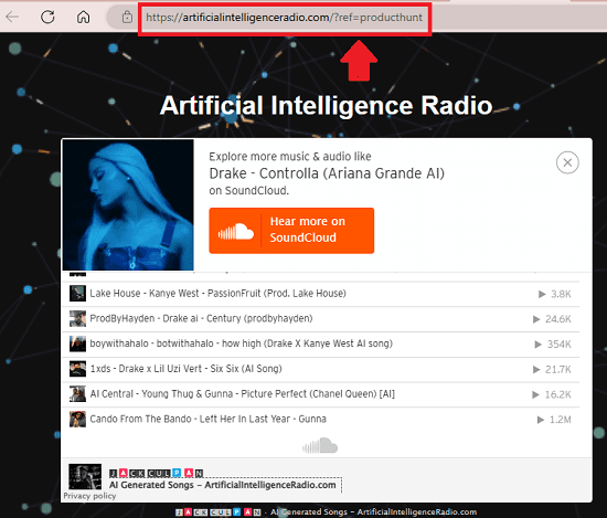One of the best places now to listen to AI-generated music is Artificial Intelligence Radio. This free website is featuring a regularly updated playlist of songs made with AI. These songs involve popular artists and ranging from different genre, mood, or style.