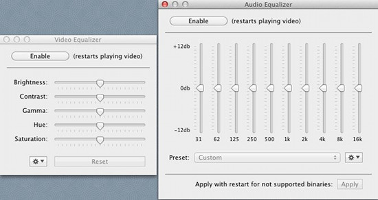 - The player supports audio and video equalizers. This keeps the application minimalistic while keeping functionality intact. This way of implementation keeps the interface simple, while still managing to keep functionality. You see this in the screenshot below.