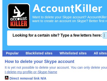 This is the reason why Skype is blacklisted, for the time being there’s no way how you can delete your account there. Gray listed services can either be deleted or not, but it’s not as easy like it is with Facebook where you get direct account removal link.