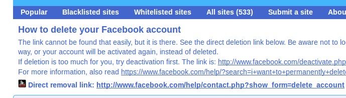 Before we begin, note that AccountKiller will only provide you with information, links and explanations on how to delete various different web services. The website itself isn’t in any other way capable of helping you out. Now the easiest way of how you can find the website that interests you is by using the search tool at the top. Use it only if you can’t find it from the list of popular websites. If you for example select Facebook: