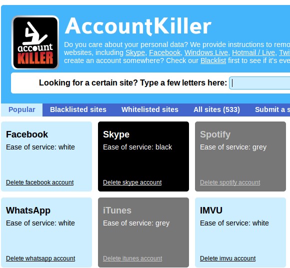 As soon as you open up the AccountKiller website you’re gonna be greeted with a list of popular websites which other users have already looked up and accessed. Facebook is at the top, and notice that each one of the squares representing a website has a different color. With the help of colors the difficulty of account deletion process can be found out. For example websites where accounts can’t be deleted easily or at all, which is the case with Skype are listed in black. Key features of AccountKiller – free online account deletion information websites are: