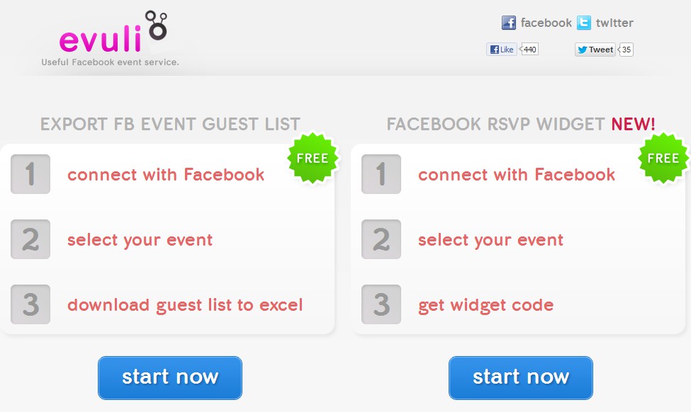 Evuli is a free online service where you can connect your Facebook account and after that you can easily export Facebook event information for the events that you have created. To be more precise, with the help of this free online Facebook event guest list extractor you can easily create a list of all the people who have decided to participate in your event.
