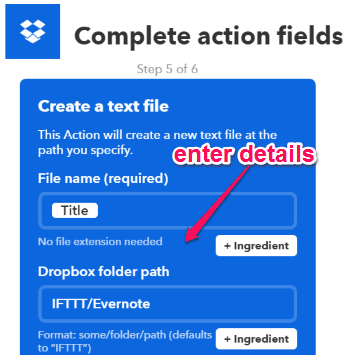 Step 7: Once you select the action, you have to complete some action fields such as File Name, Dropbox folder path where the notes will be stored, text file body, etc. Then you can simply go ahead and activate the applet.