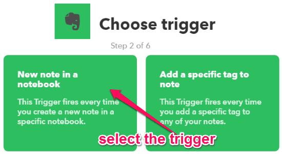 Step 4: After you have selected the trigger, it will ask you to complete the trigger by selecting the specific notebook in which you will create the notes for backup. Click on the drop-down menu and select any of your Evernote notebooks.