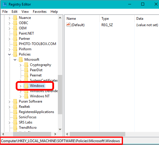 Step 1: Open “Registry Editor” window using Run dialog box. Now go to:  HKEY_LOCAL_MACHINE\SOFTWARE\Policies\Microsoft\Windows