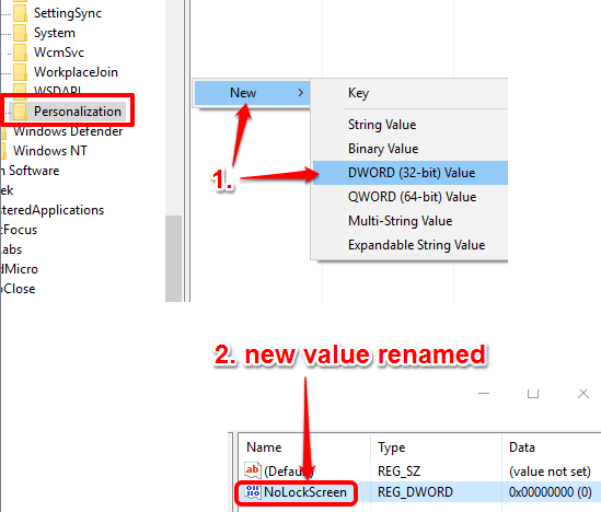 Step 3: Add a new DWORD value under Personalization key. For this, right-click on the free space → New → DWORD (32-bit) Value. After creating the new value, you need to rename it to NoLockScreen.