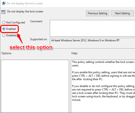 Step 3: Double-click Do not display the lock screen option and a window will open. In that window, select Enabled option, and save changes using OK button.