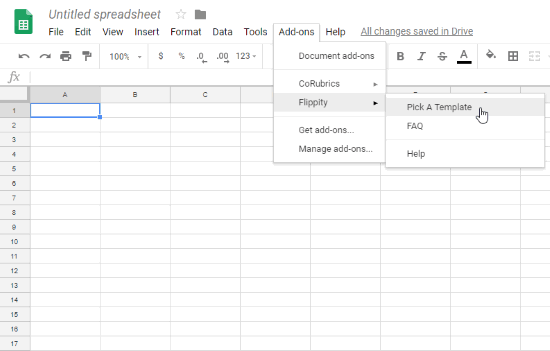 Step 2: When you accept the permission, a new Google sheet opens. You can now click on Add-ons -> Flippity -> Pick A Template as shown below.