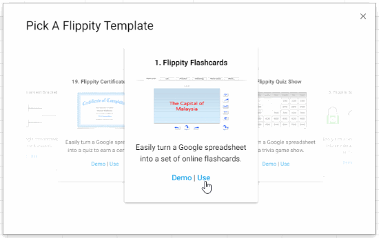 Step 3: When you click on Pick A Template, you will see many Flippity templates appear. One of them is Flippity Flashcard Template which you can use by clicking on Use as shown below.