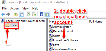 Step 2: lusrmgr (Local Users and Groups) window will open. In that window, first, select Users folder and then double-click on the local account name for which you want to set password expiration.