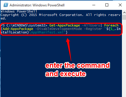 Get-AppxPackage -AllUsers| Foreach {Add-AppxPackage -DisableDevelopmentMode -Register “$($_.InstallLocation)\AppXManifest.xml”}
