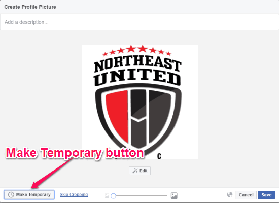 Step 3: After selecting or uploading a photo, the editor window will appear where you can crop and edit the picture before making it your profile picture. At the bottom of the editor window, there will be a button named, “Make Temporary” which you can use to set the picture as a temporary profile picture for a specific time.