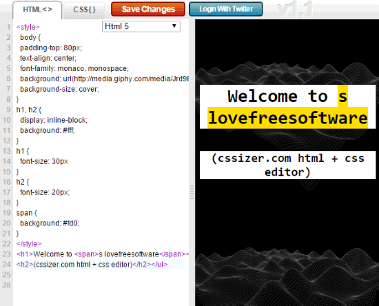 Cssizer.com is another simple HTML editor website with Live preview. It supports HTML as well as CSS. You can simply paste the code at left pane and instant preview will visible in the right pane.