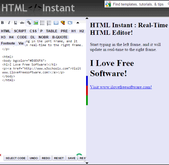 HTML Instant is also a good choice to practice HTML online and view live preview. You need to enter HTML, JavaScript, or CSS in the left pane and output is visible in the right pane. It covers almost all the features that I have explained for the above website.