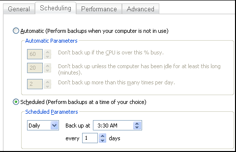 Mozy provides very flexible options to schedule your backup. You can choose to have Mozy start auto backup whenever your computer is idle for some time (you can specify this time in terms of minutes).